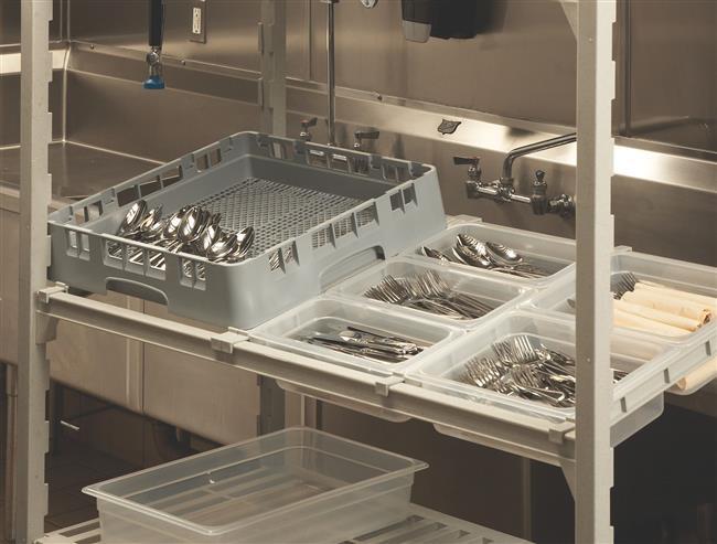 Použite na efektívne namáčanie. umývať a vystavovať striebro. Stojan na príbory sa spája so všetkými ostatnými stojanmi a hodí sa do každej komerčnej umývačky riadu. Hladký horný okraj každého regálu zaisťuje hladké a bezpečné stohovanie.